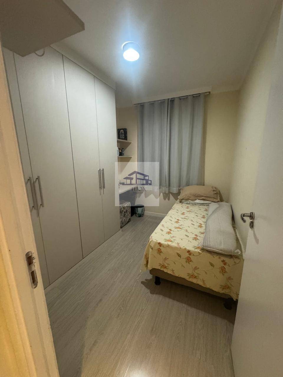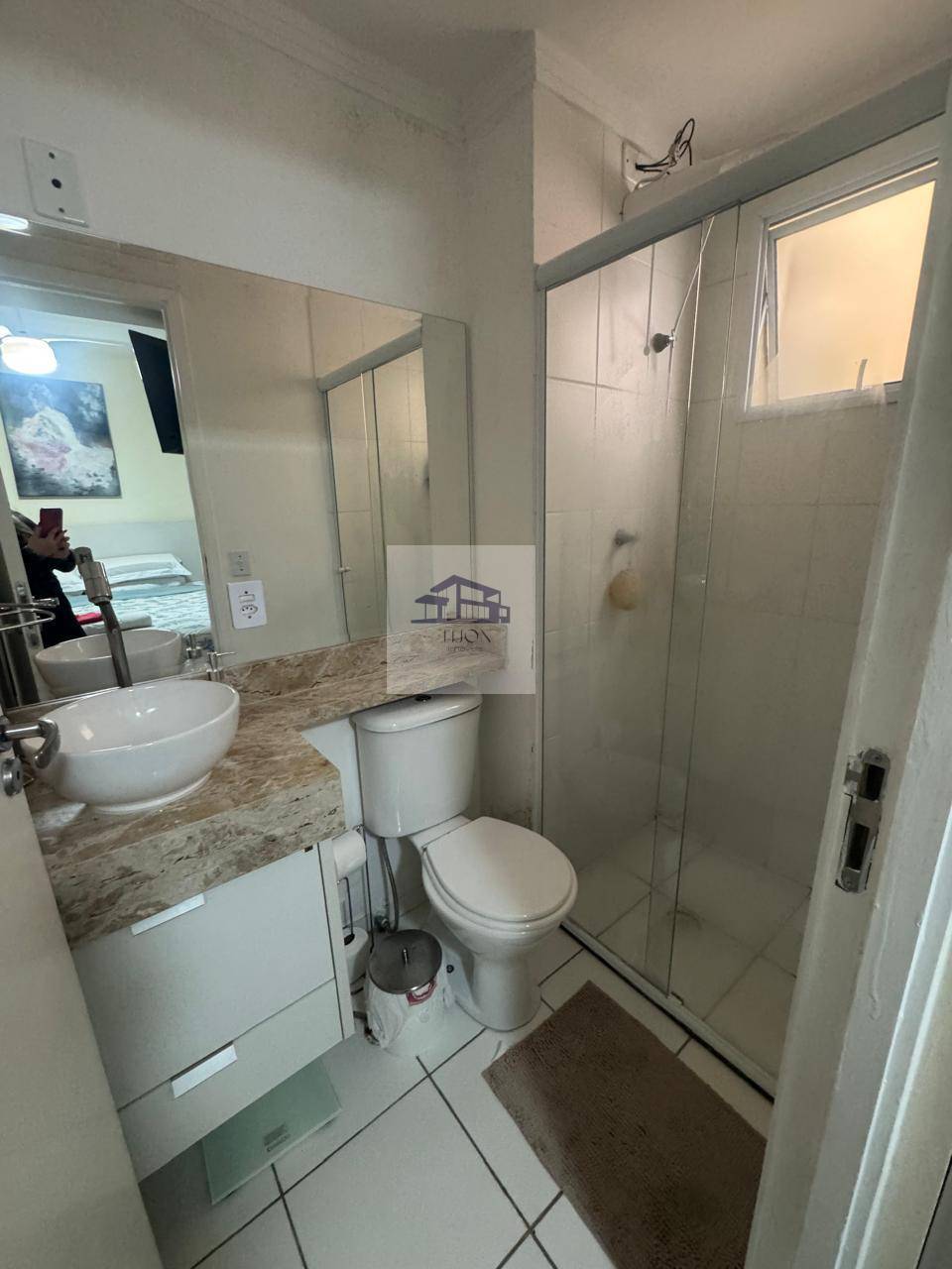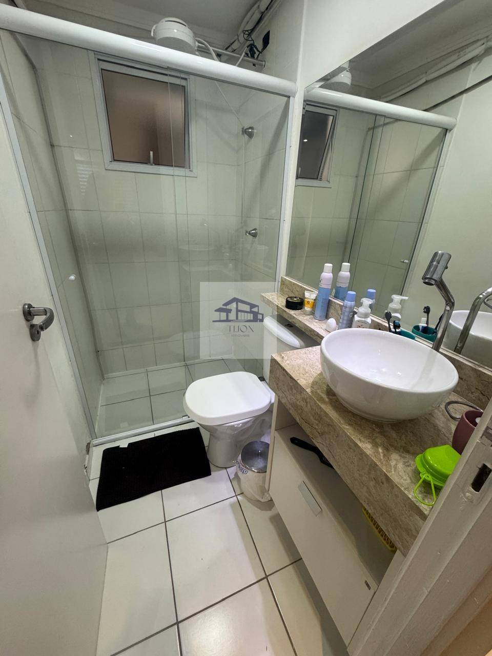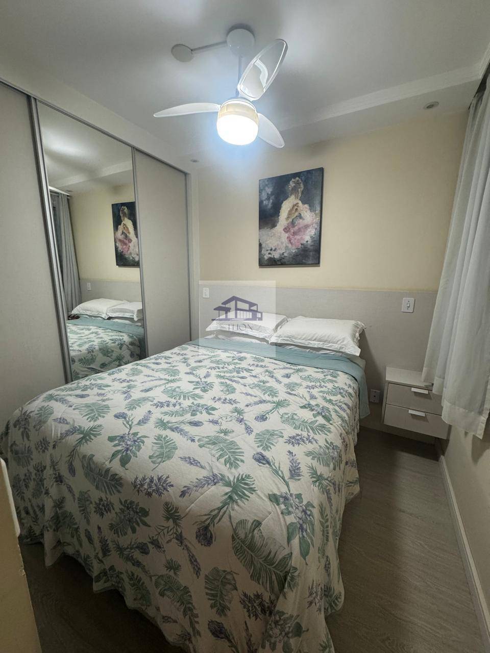 Nos dormitórios, há dois espaços bem planejados, ambos com armários embutidos. Um dos quartos é uma suíte, que vem equipada com ar-condicionado e ventilador de teto, proporcionando um ambiente tranquilo e confortável. O banheiro social é bem equipado, contando com um gabinete, uma pia estendida e box em vidro, conferindo um toque de modernidade.
