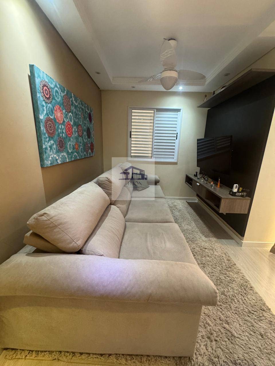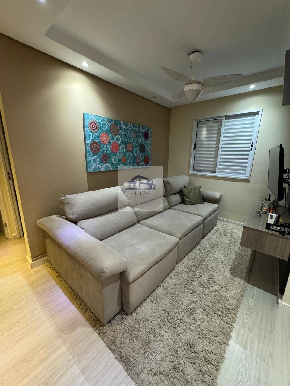 A sala de TV é um convite ao lazer, com um painel para TV e um ventilador de teto que garante conforto durante os momentos de entretenimento. A cozinha, que é conjugada com a sala, conta com um balcão prático, armários planejados, e um fogão embutido, oferecendo tanto estética quanto eficiência para o dia a dia.