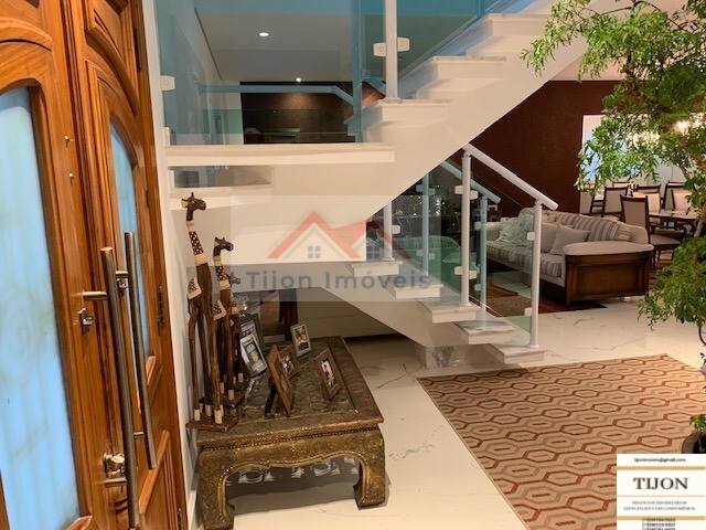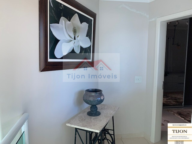 Área Interna Casa, parte Alta: Junto ao Hall de entrada, uma escada vazada para ficar mais leve a casa com piso de madeira serve o andar acima, onde há 3 quartos. Um quarto do casal, com closet, um bom banheiro com banheira de hidromassagem, outros dois quartos todos com armários embutidos e com mais um banheiro, uma varanda coberta para a parte interna da casa, e uma cobertura de ligação da casa principal com a edícula na parte externa área de cima.