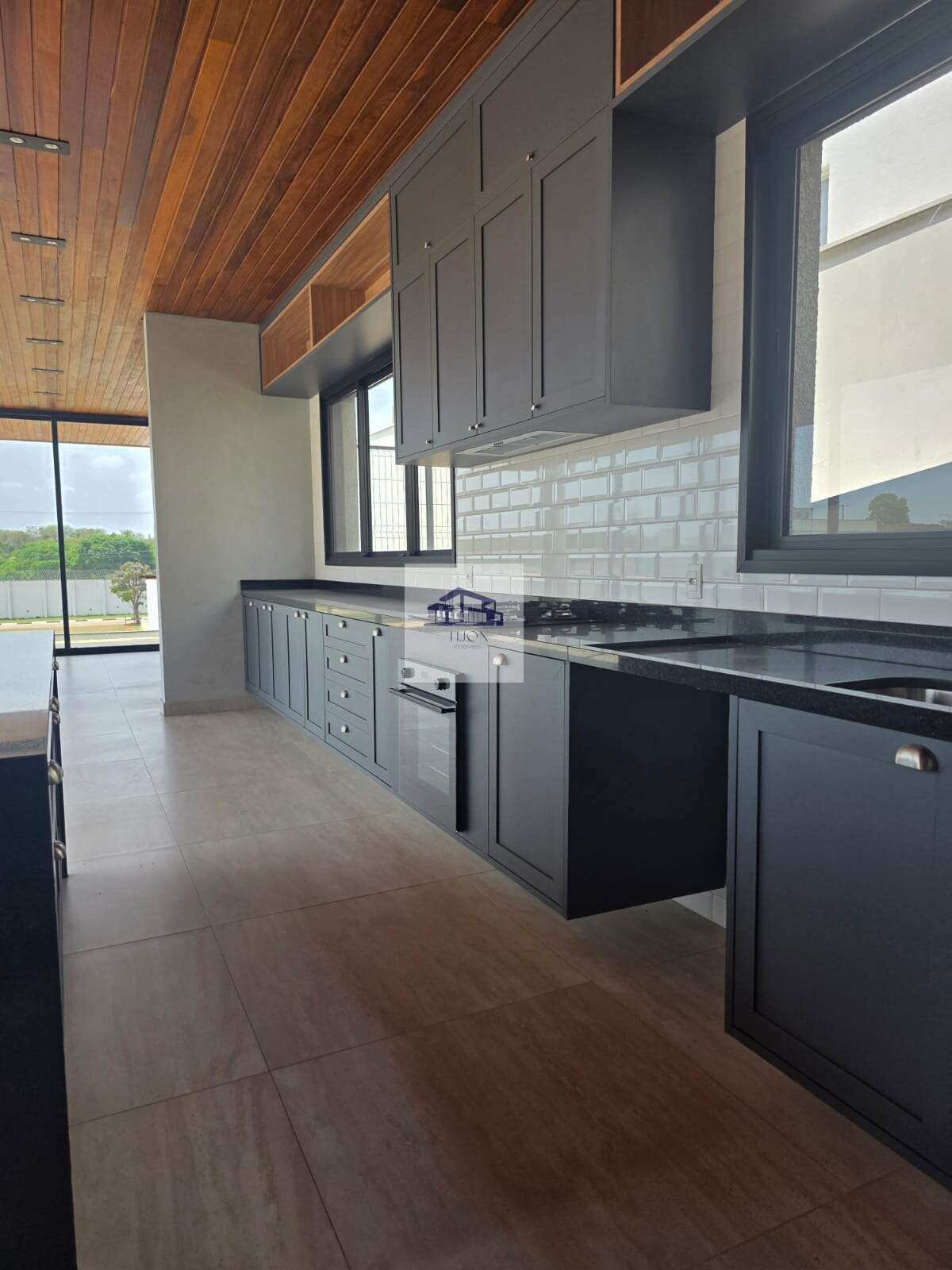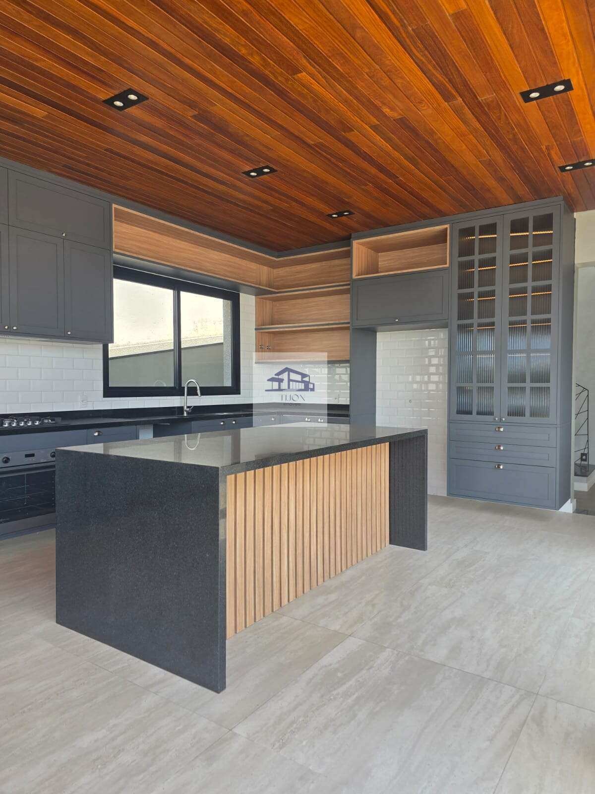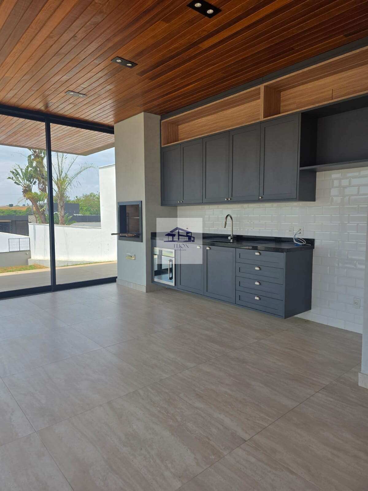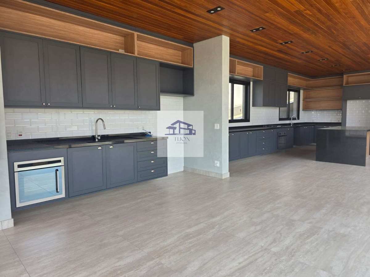 Cozinha americana com despensa prática, integrada diretamente à área gourmet com churrasqueira.